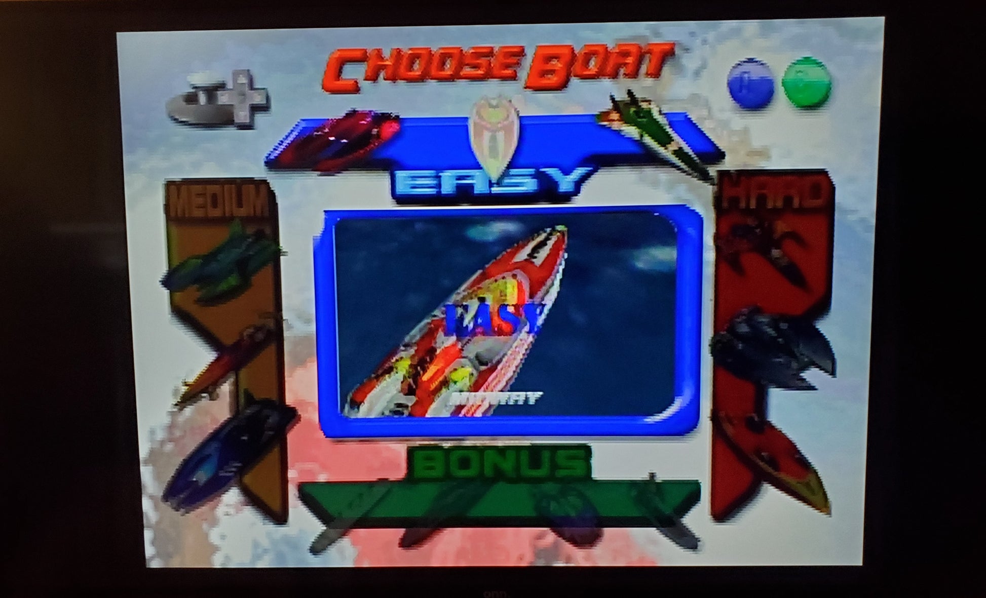 Scattered across the tracks are blue and red boost icons. When touched, these icons allow the player who touched them to boost. Red boost icons are more scarce than blue boost icons because they give more boost fuel. When a player has boost fuel, they may use the boost button to boost, which increases the boat's speed and allows the player knock other boats into the air, a feature described by the game as the Mighty Hull. Another aspect of boosting is the Hydro Jump, which is performed by braking and using the boost button. When combined with the many ramps on the tracks, players can reach short cuts and boost icons that would otherwise be inaccessible.