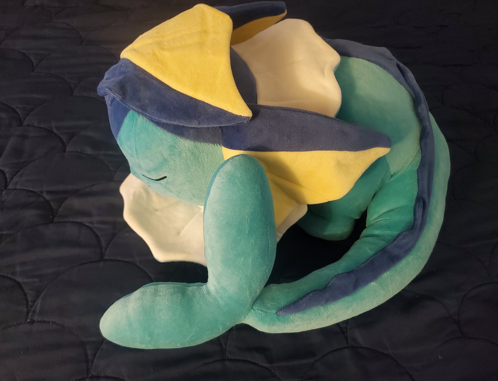One of the most popular Eeveelutions, Vaporeon, this soft sleeper plush is a perfect addition to any Pokemon collection. This is a Pokemon Center Original, with the official tag included. This is a great gift for any Pokemon fan. An authentic, original, with tags included, Pokemon Center original sleeper plush. These hard to find, sought after sleeper plushes, make a perfect addition to any Pokemon collection. You'll be surprised how big and soft these plushes are in person! This plush toy is brand new. The full dimensions are approximately 24 x 46 x 42 cm. Celebrate your love for Pokemon by getting your favorite one as a stuffed plush!
