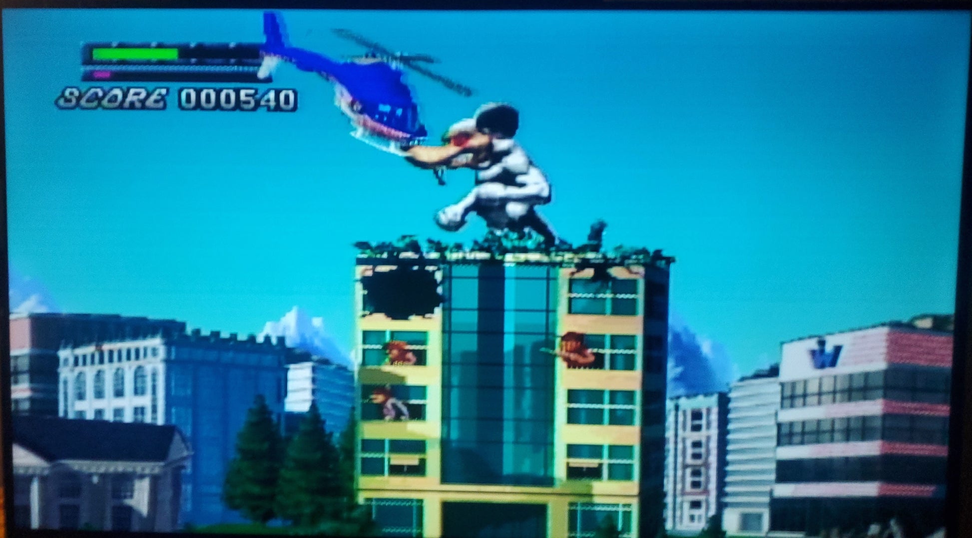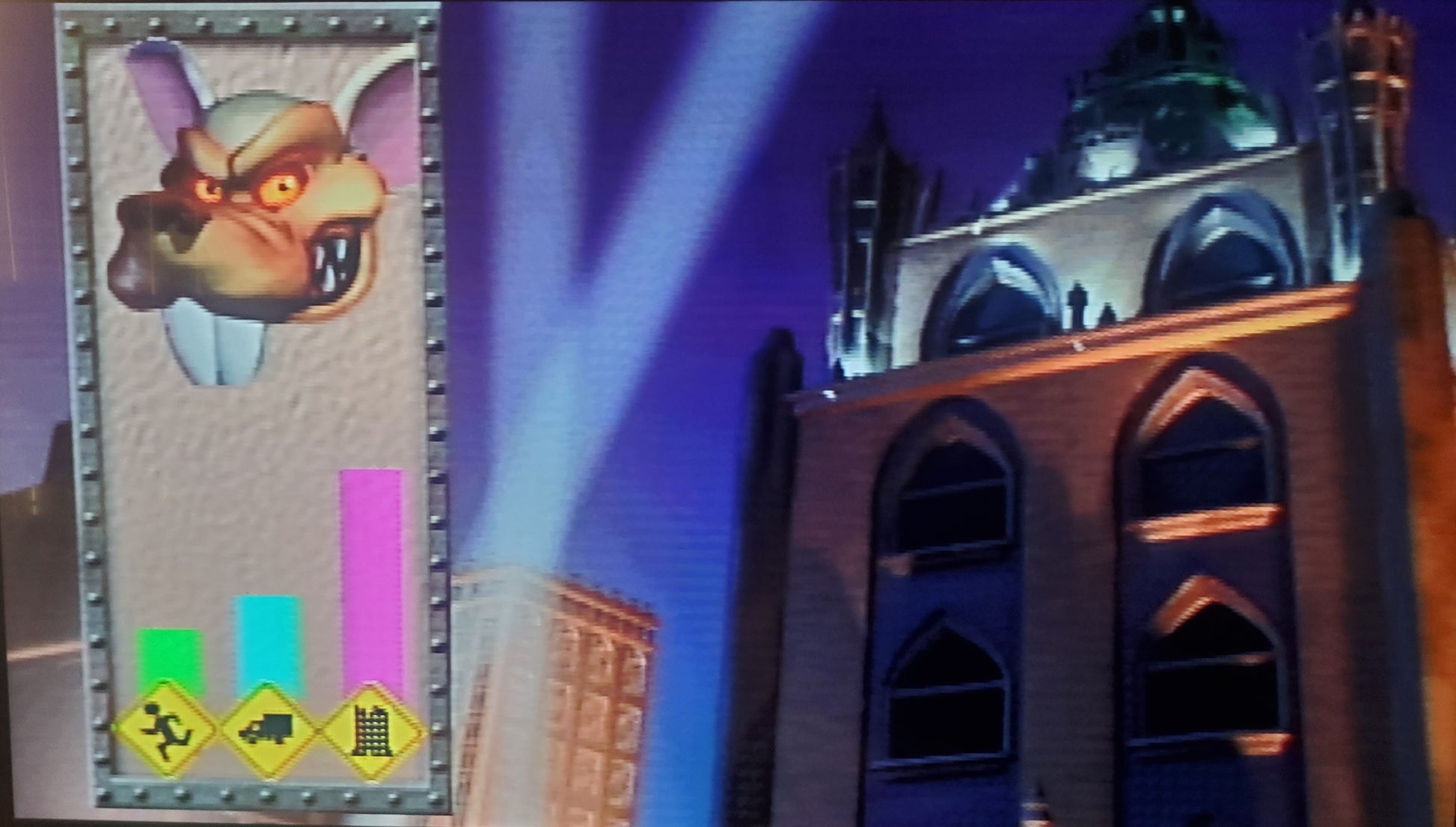 Rampage 2: Universal Tour for N64 (1999) is a 3D action game where players control monsters---Boris (Rhino), Ruby (Lobster), or Curtis (Rat)---to destroy cities, eat people, and smash military vehicles to rescue the original monsters (George, Lizzie, Ralph) from Scumlabs. It features 125+ levels, 3-player capability, and boss fights